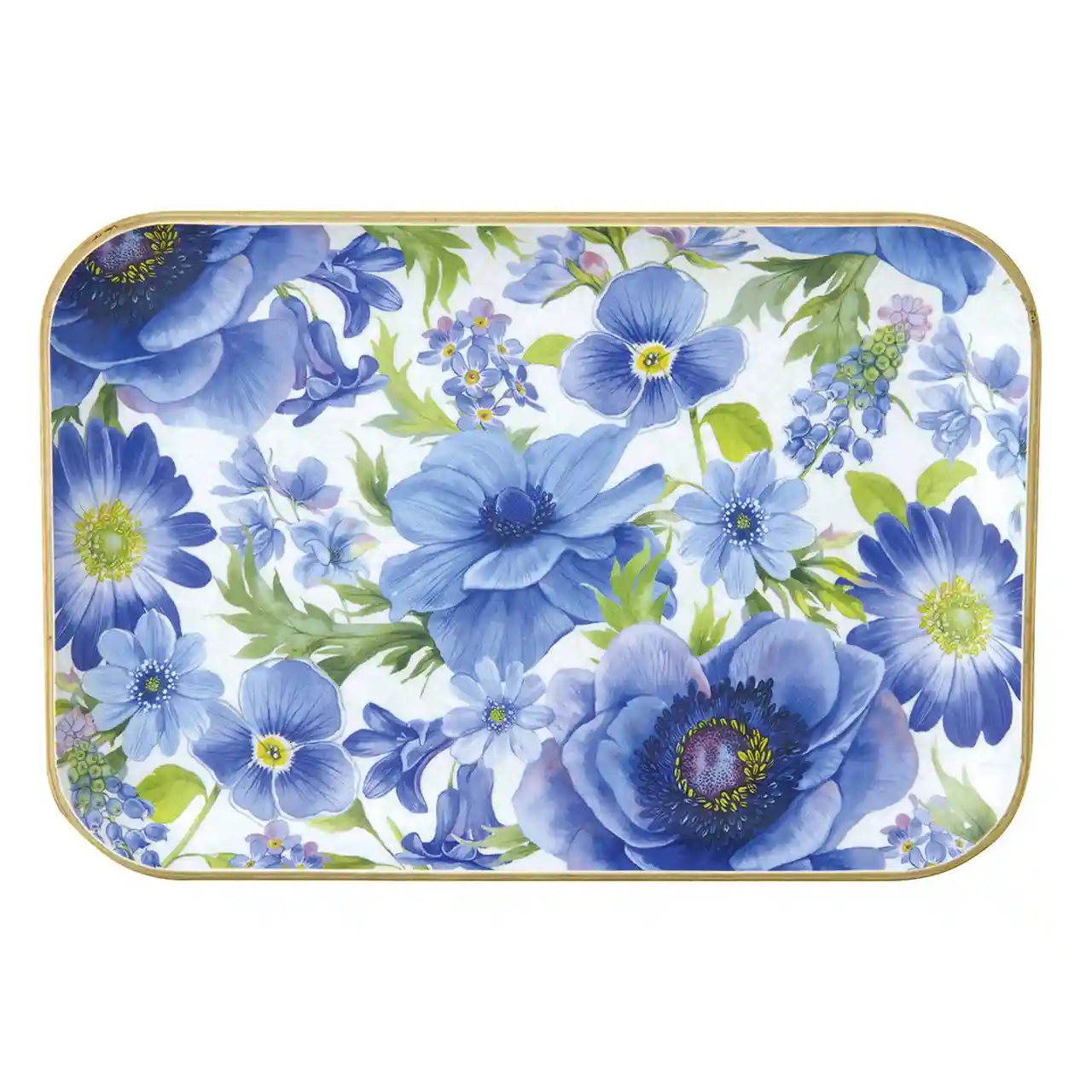 Dit rechthoekige dienblad Springtime Blues van Ihr is voorzien van een rijk, blauw bloemmotief dat doet denken aan een uitbundig lenteboeket. De fijne details en subtiele houtkleurige rand geven het geheel een elegante uitstraling. Ideaal voor het serveren van thee, koffie of kleine lekkernijen, en tegelijkertijd een decoratieve blikvanger in huis.