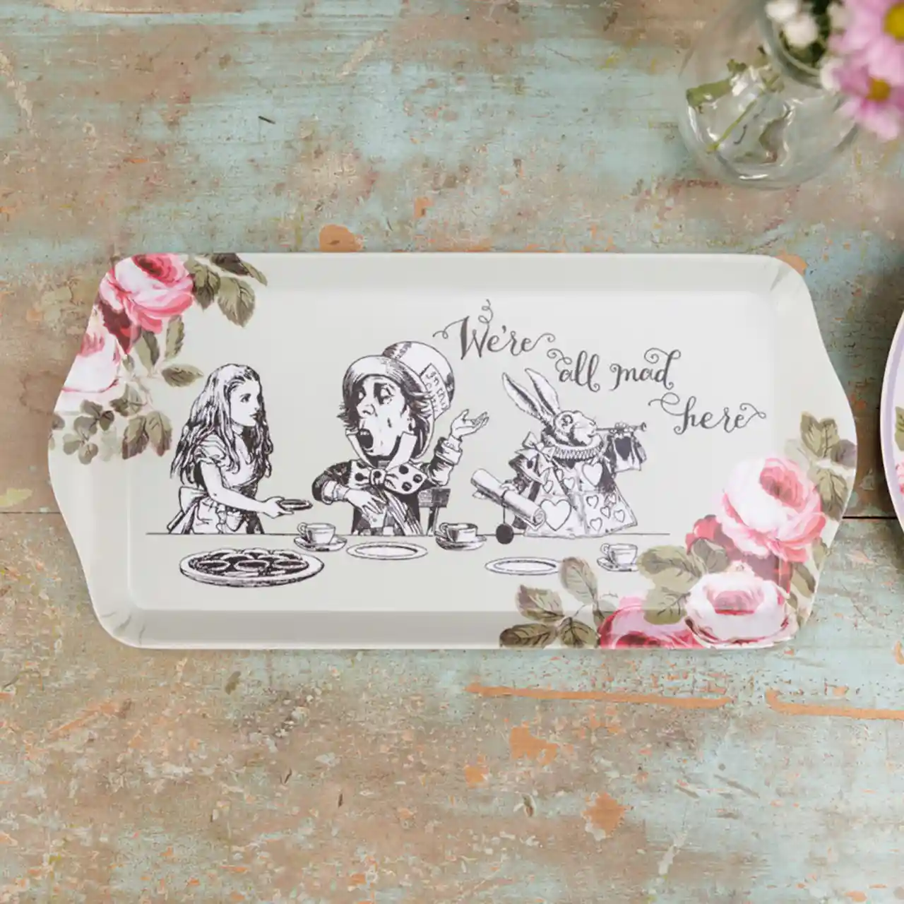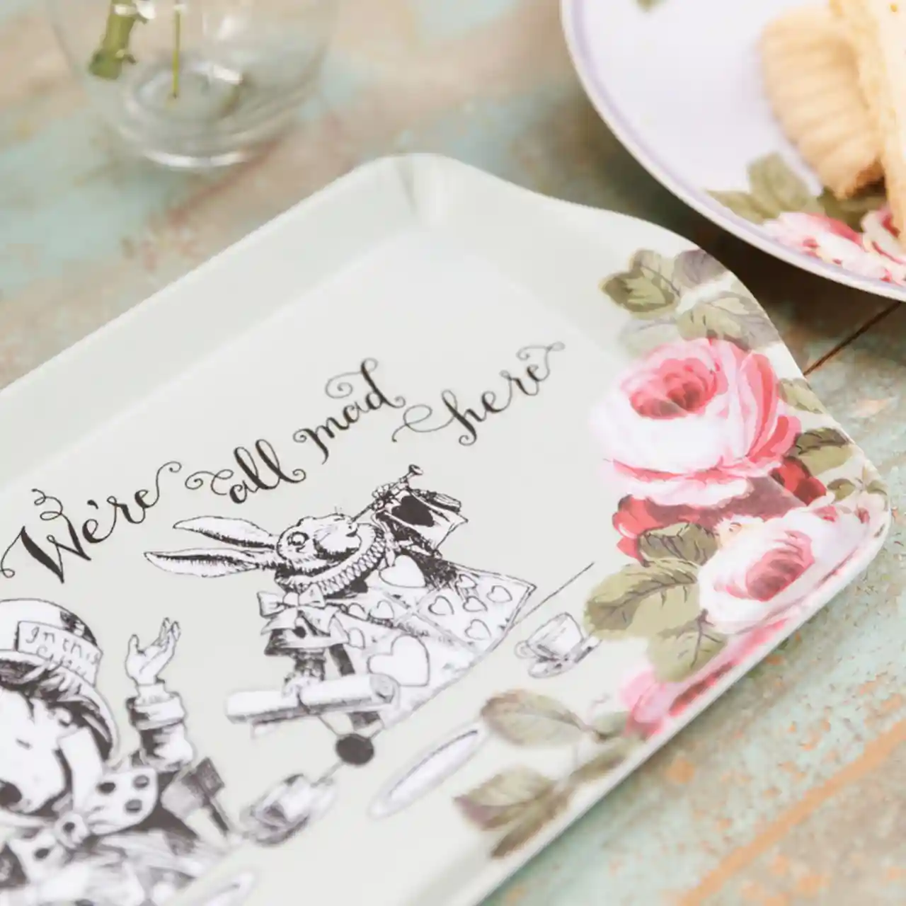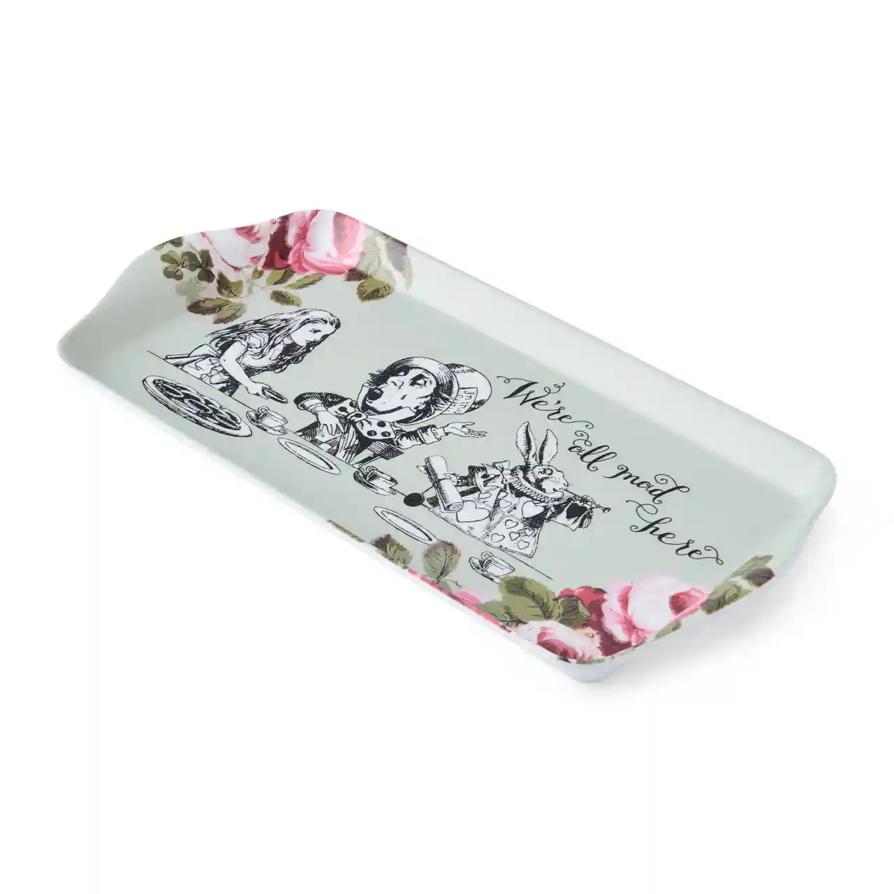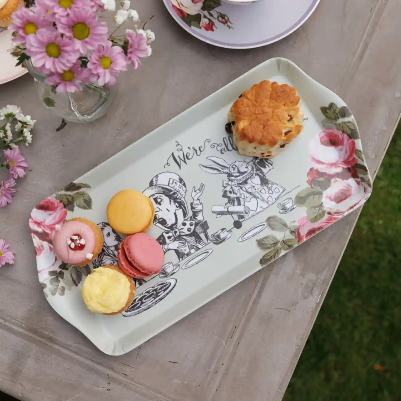Dompel jezelf onder in de grillige wereld van Alice, dit dienblad is gedetailleerd met ingewikkelde illustraties opgefleurd met pastelkleuren en de V&A’s kenmerkende bloemen. Perfect ontworpen voor middagthee en tuinfeestjes, gemaakt van vrijwel onbreekbaar melamine met gebogen randen voor morsvrij transport en een comfortabele grip. Dit charmante dienblad is ook geschikt voor het vervoeren van verwarmde etenswaren zoals quiches en taartjes tot 30°C.