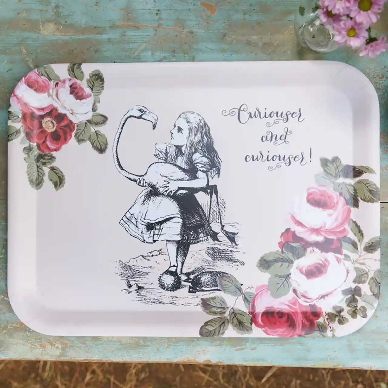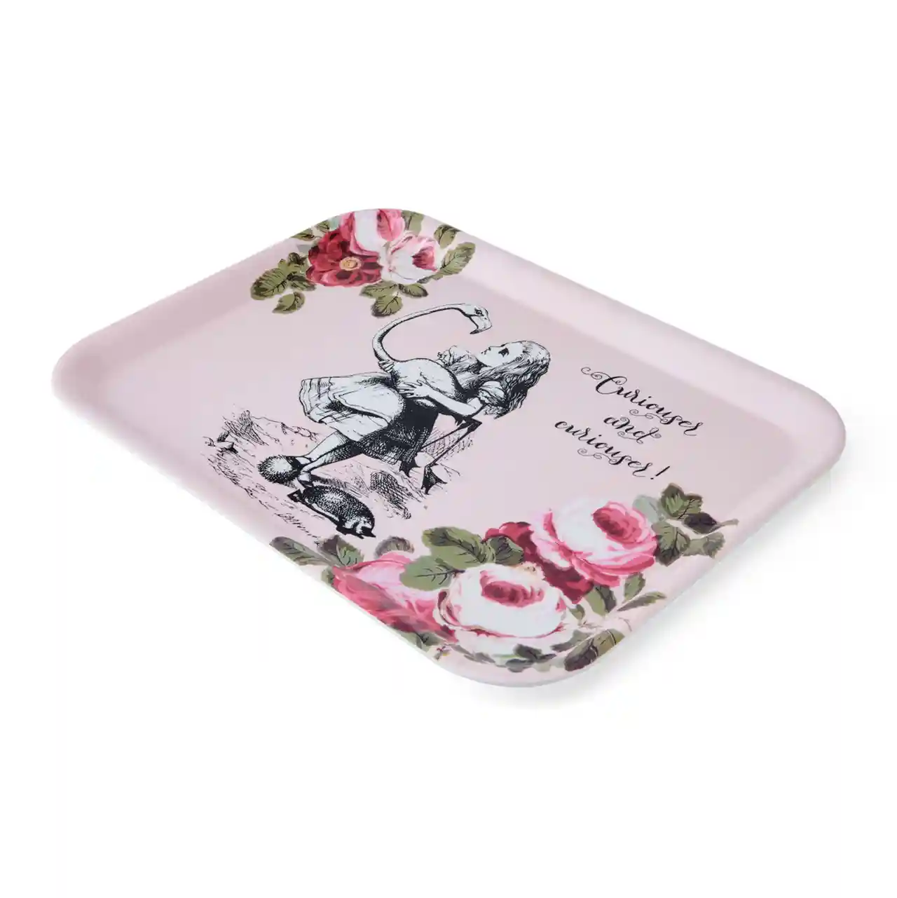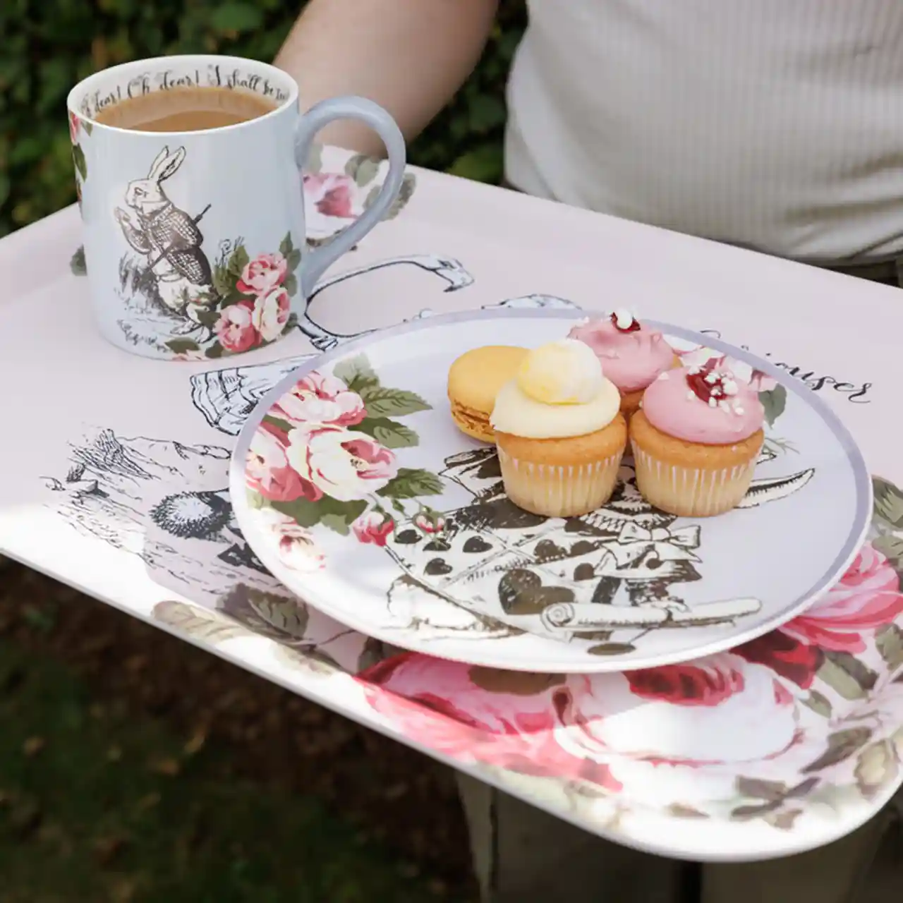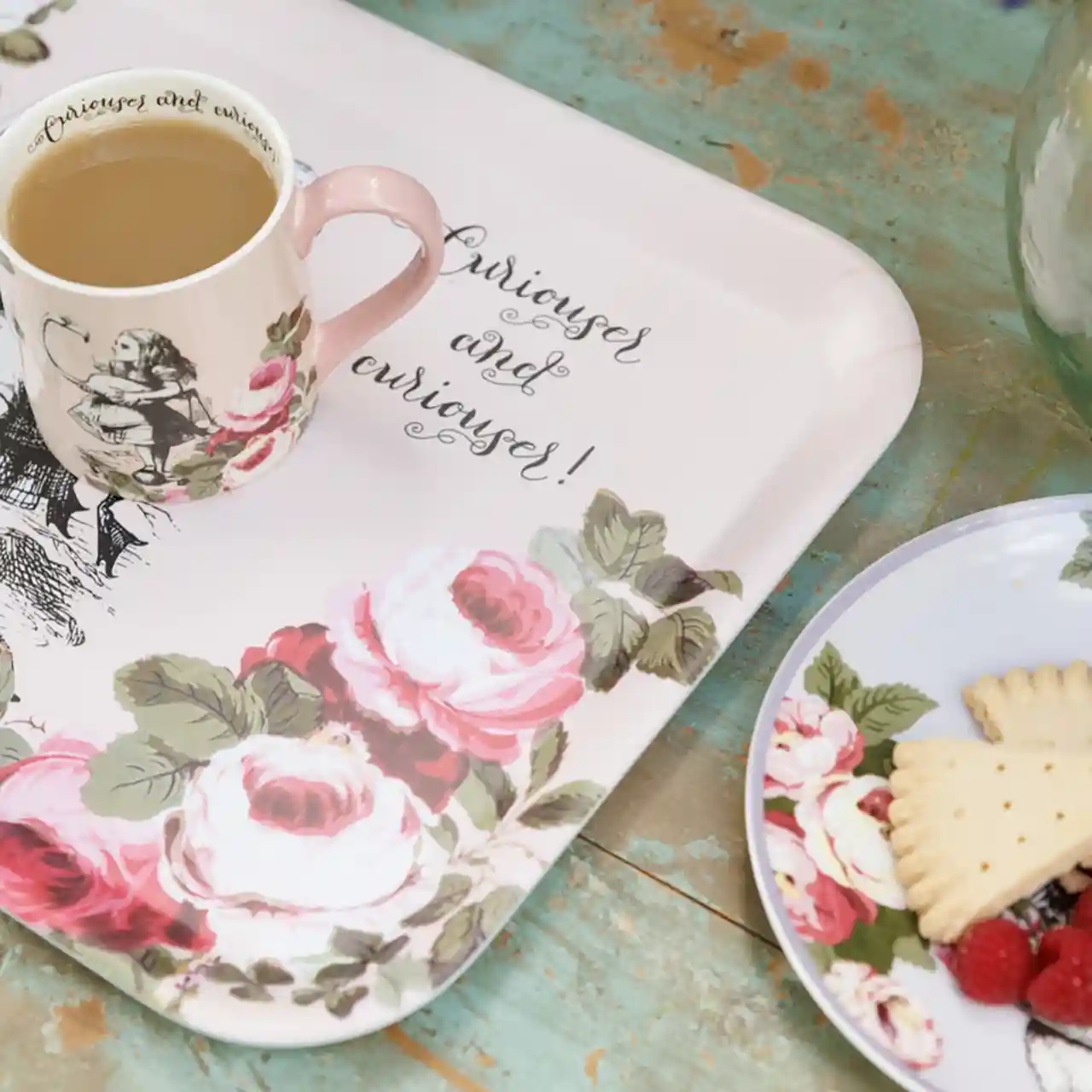 Dompel jezelf onder in de grillige wereld van Alice, dit dienblad is gedetailleerd met ingewikkelde illustraties opgefleurd met pastelkleuren en de V&A’s kenmerkende bloemen. Perfect ontworpen voor afternoon tea en tuinfeestjes, gemaakt van vrijwel onbreekbaar melamine met gebogen randen voor morsvrij transport. Dit charmante dienblad is ook geschikt voor het vervoeren van verwarmde etenswaren zoals quiches en taartjes tot 30°C.