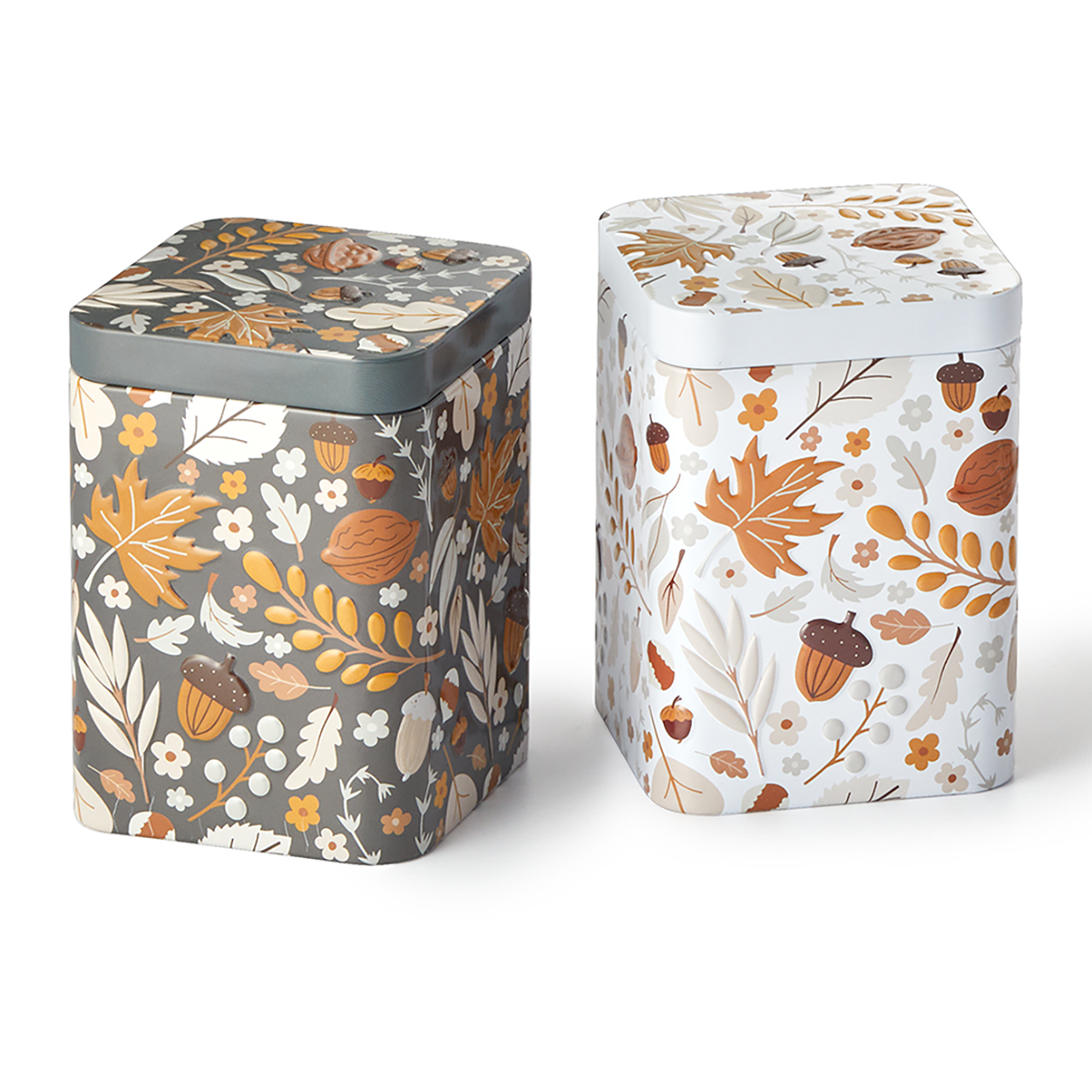 Het gedetailleerde herfstmotief van theeblik Hazel is voorzien van een fijn geïllustreerd patroon van diverse bladeren, noten en herfstbloesems. Kunstzinnig gerangschikt in harmonieuze tinten bruin en oker, geeft de kleurstelling van het blik het een natuurlijke elegantie die van elke theepauze een klein herfstfeestje maakt. De verfijnde reliëfversiering voegt een bijzonder elegante touch toe.