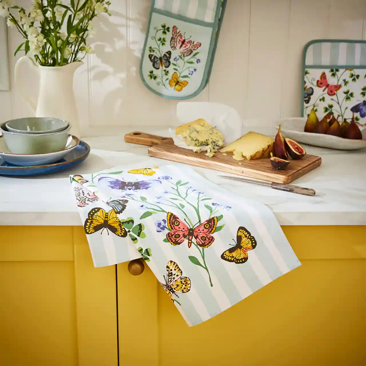 Dit assortiment keukenlinnen is gemaakt van 65% gerecycled katoen en 35% nieuw katoen.