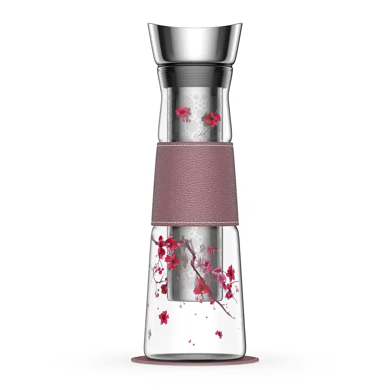 Het duurzame borosilicaatglas is bestand tegen hoge temperaturen, terwijl de decoratieve hoes van veganistisch leer uw handen beschermt tegen de hitte. Het roestvrijstalen klapdeksel met geïntegreerd filter zorgt ervoor dat er geen druppels ontsnappen tijdens het inschenken.