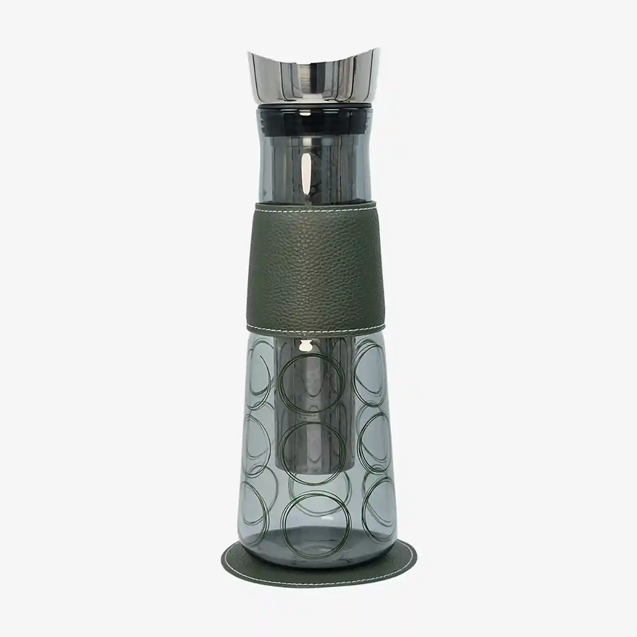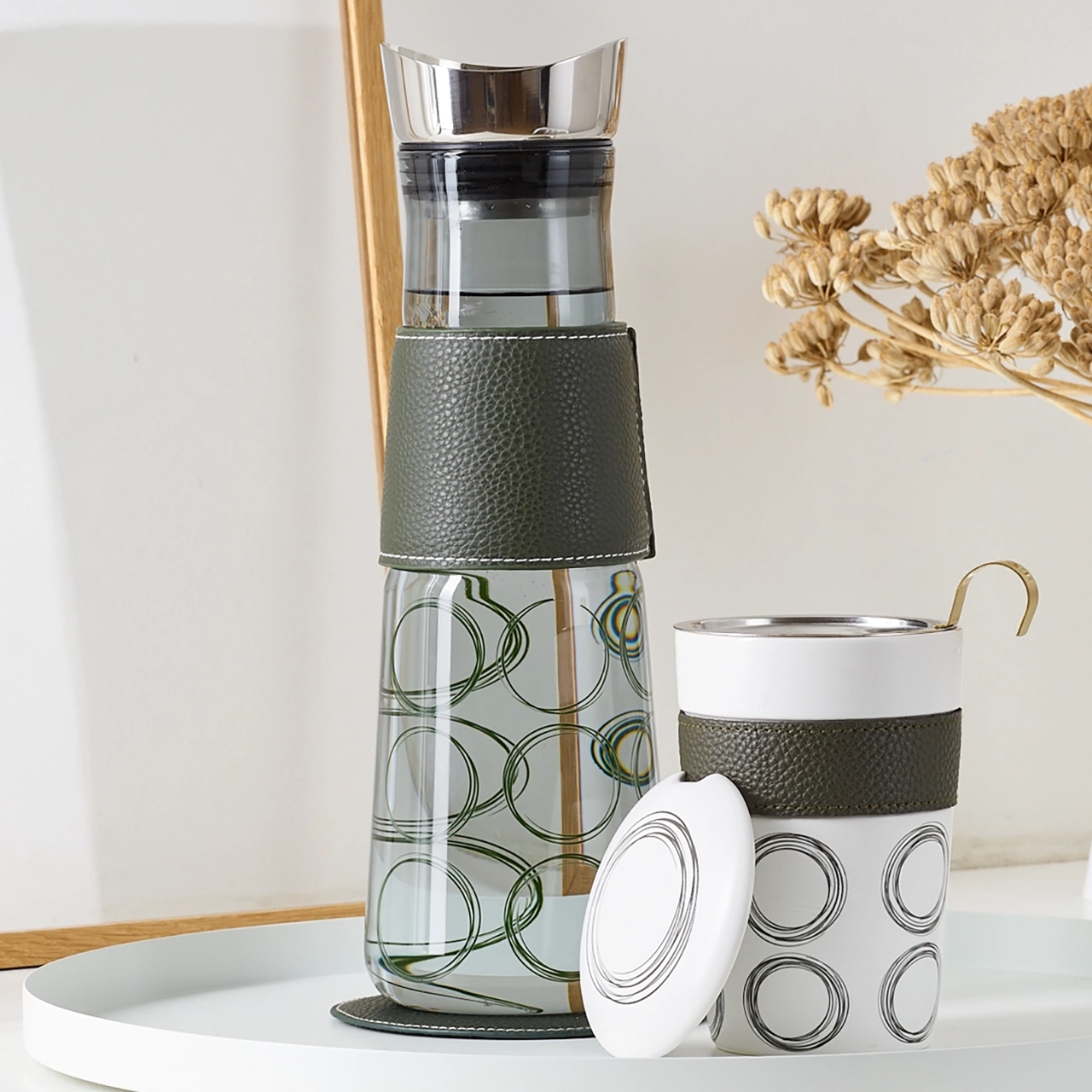 Het duurzame borosilicaatglas is bestand tegen hoge temperaturen, terwijl de decoratieve hoes van veganistisch leer uw handen beschermt tegen de hitte. Het roestvrijstalen klapdeksel met geïntegreerd filter zorgt ervoor dat er geen druppels ontsnappen tijdens het inschenken.
