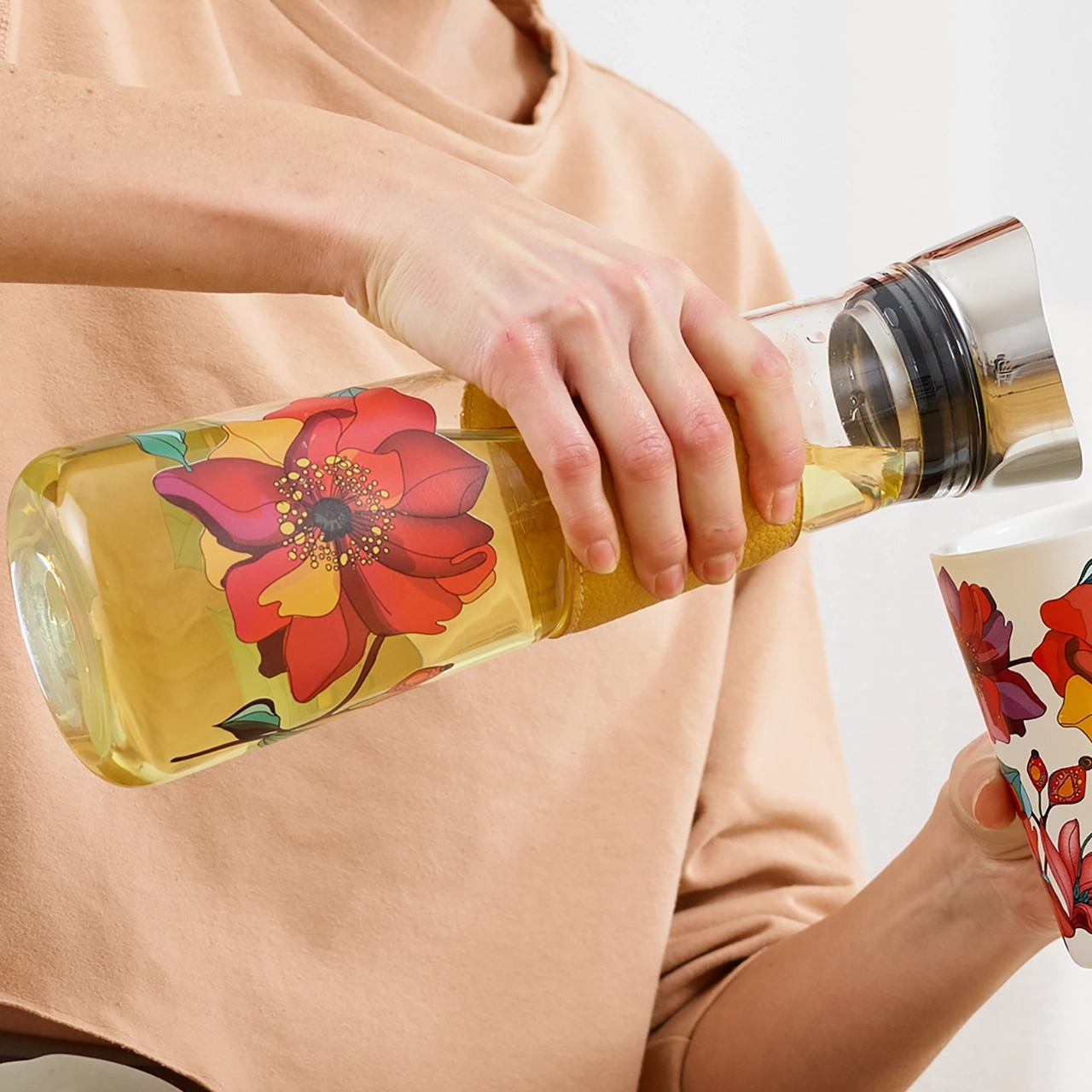 Het duurzame borosilicaatglas is bestand tegen hoge temperaturen, terwijl de decoratieve hoes van veganistisch leer uw handen beschermt tegen de hitte. Het roestvrijstalen klapdeksel met geïntegreerd filter zorgt ervoor dat er geen druppels ontsnappen tijdens het inschenken.