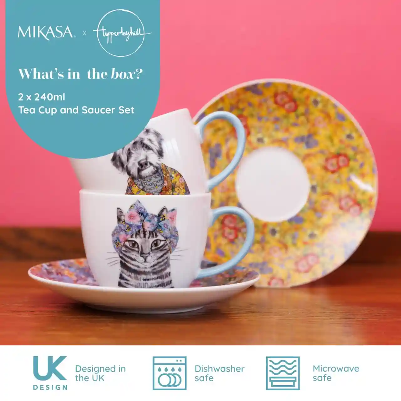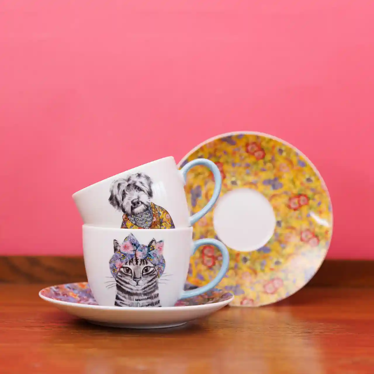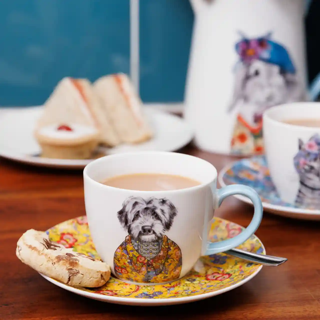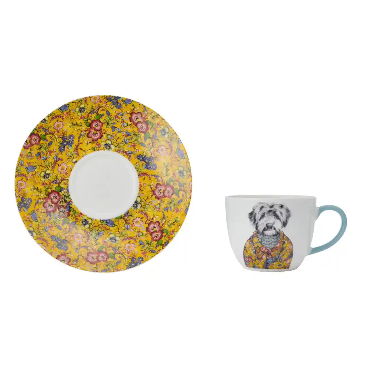 Het exclusieve handgeschilderde ontwerp toont een trouwe hond in kleurrijk bloemenjasje — een onweerstaanbare combinatie van speelsheid en stijl, typerend voor kunstenaar Tipperleyhill. De schotel is versierd met een bijpassend bloemenmotief dat perfect aansluit bij de illustratie op de kop. Gemaakt van hoogwaardig porselein en geschikt voor zowel vaatwasser als magnetron.