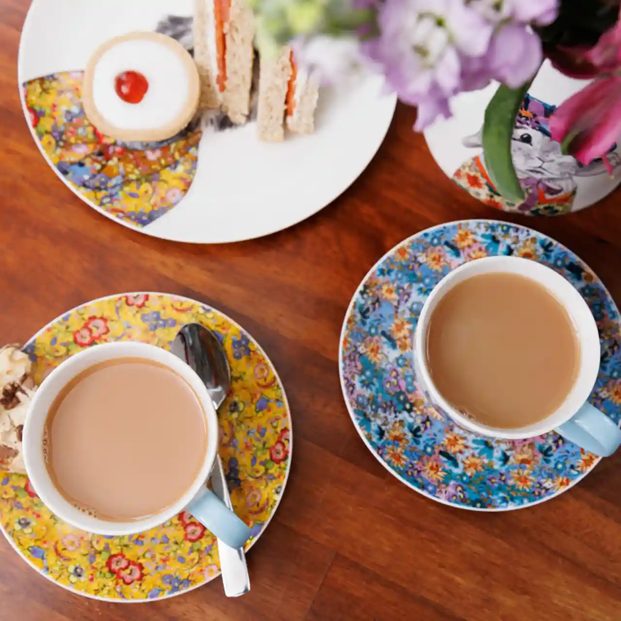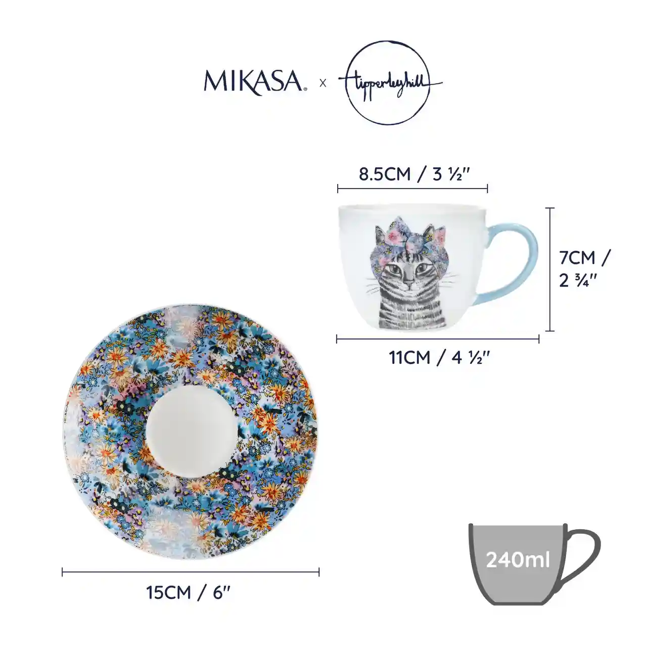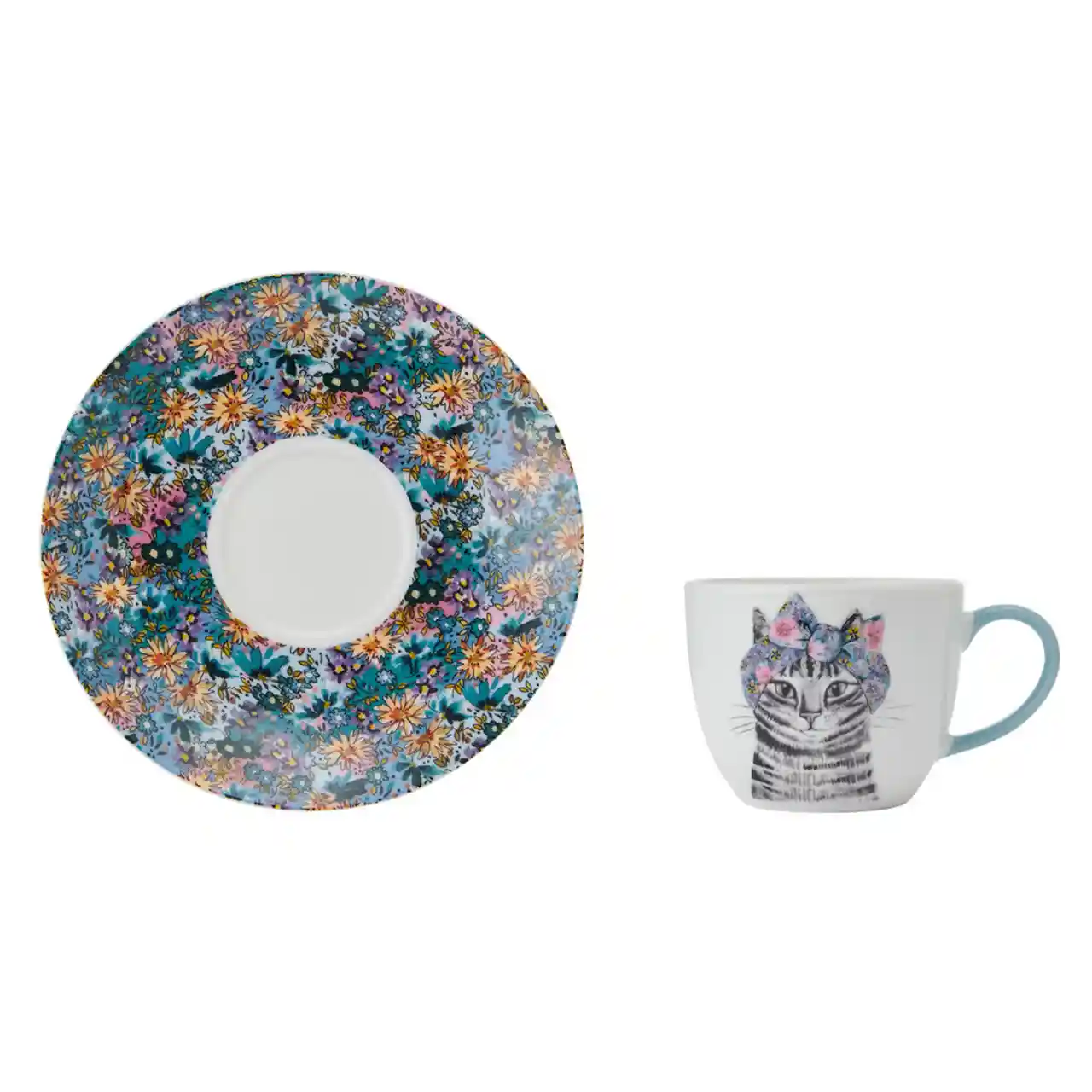 Het handgeschilderde ontwerp toont een stijlvolle kat met bloemrijke hoofddoek, een typisch speelse creatie van kunstenaar Tipperleyhill vol Britse humor en kleur. De binnenzijde van de schotel is versierd met een subtiel bloemenpatroon dat perfect aansluit bij het ontwerp van de kop. Gemaakt van hoogwaardig porselein en zowel vaatwasser- als magnetronbestendig.