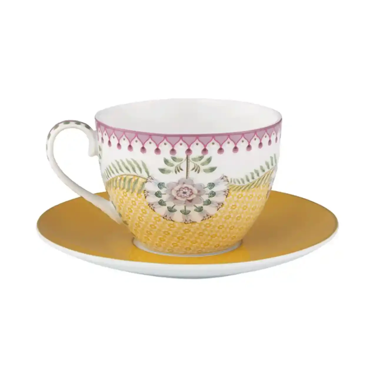 Het Lily & Lotus servies is versierd met grote fantasierijke lelies, lotusbladeren en paardenbloemen in pasteltinten. De bloemen en sierlijke varens zijn symmetrisch geplaatst, waardoor dit elegante servies een moderne twist krijgt. Naast de botanische decors zijn een aantal items ook versierd met een bijpassende caleidoscopische print, bestaande uit honderden kleine bloemen en bladeren. De herhaling en details in deze print geven je het gevoel alsof je door een prisma kijkt. Veel van de items zijn afgewerkt met een extra decoratieve geometrische rand.