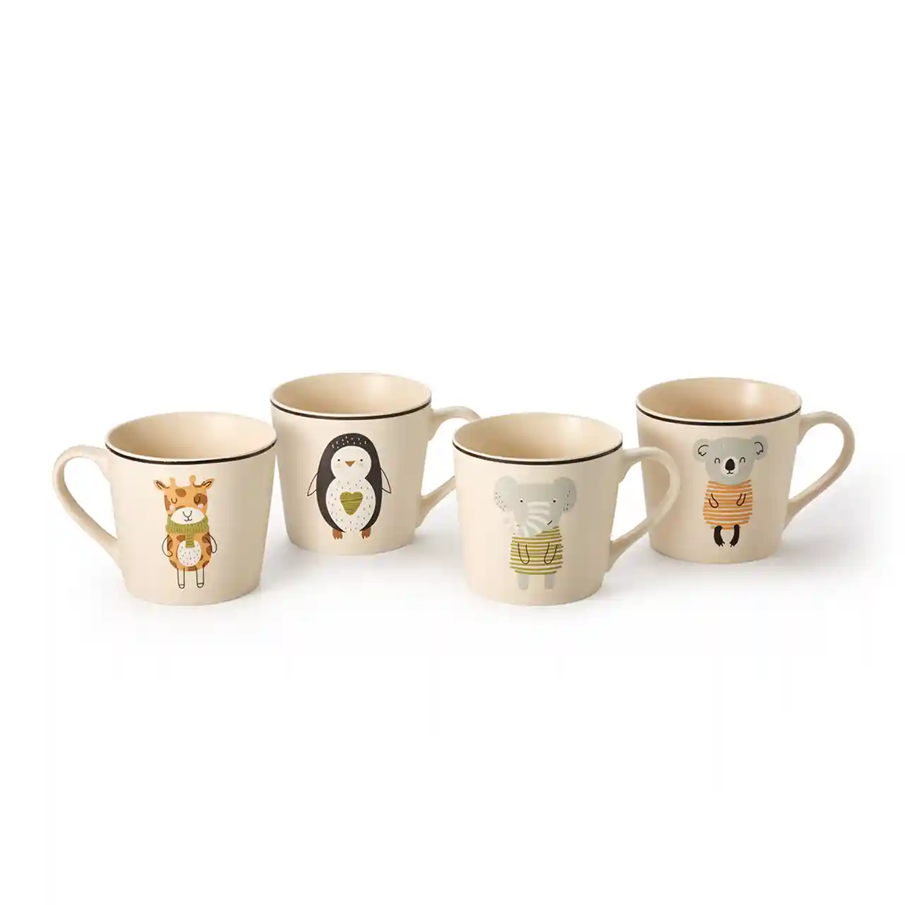 Of het nu de giraffe is met zijn charmante wollen sjaal, de olifant en de koala in hun schattige gestreepte outfits, of de pinguΓ―n met een hartje, de theemok Happy Friends is gegarandeerd een hit!