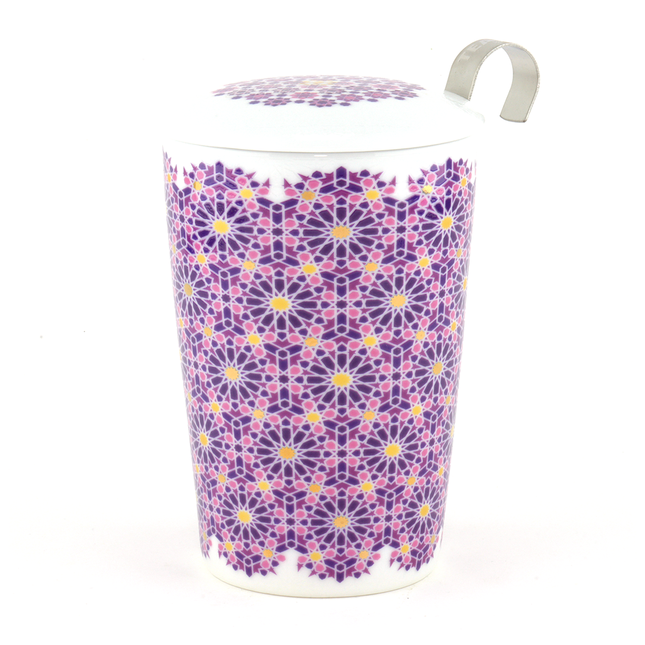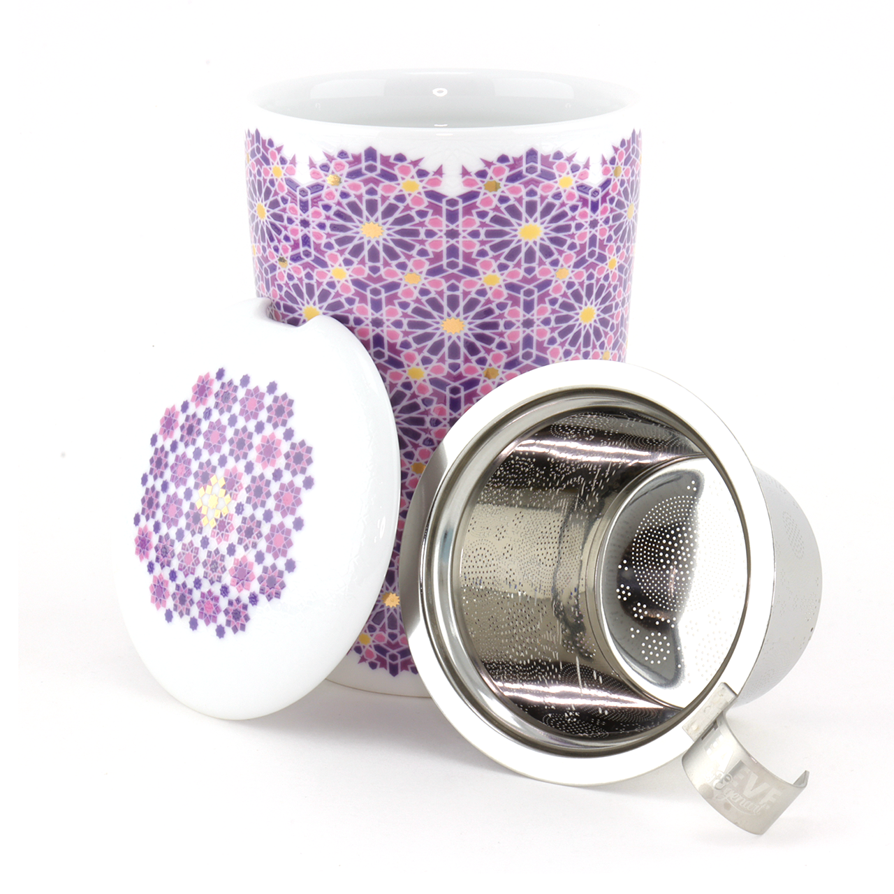 De dubbelwandige porseleinen Eigenart Teaeve Andulsia Berry theemok met een inhoud van 350 ml ligt prettig in de hand en houd je thee langer warm. De grote roestvrijstalen zeef met gedetailleerde perforatie is perfect voor de ideale ontwikkeling van het theearoma. Het bijpassende porseleinen deksel kan worden gebruikt om de mok af te dekken en als rustplaats voor de roestvrijstalen zeef.