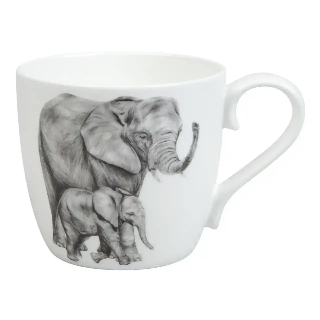 Deze Könitz Amazing Animals-mok met olifanten toont een ontroerend moment tussen een volwassen olifant en haar jong, rustig samen op pad. De fijne, potloodachtige illustratie geeft de mok een zachte en tijdloze uitstraling. Gemaakt van hoogwaardig porselein: een warme, vertrouwde mok voor elk thee- of koffiemoment.