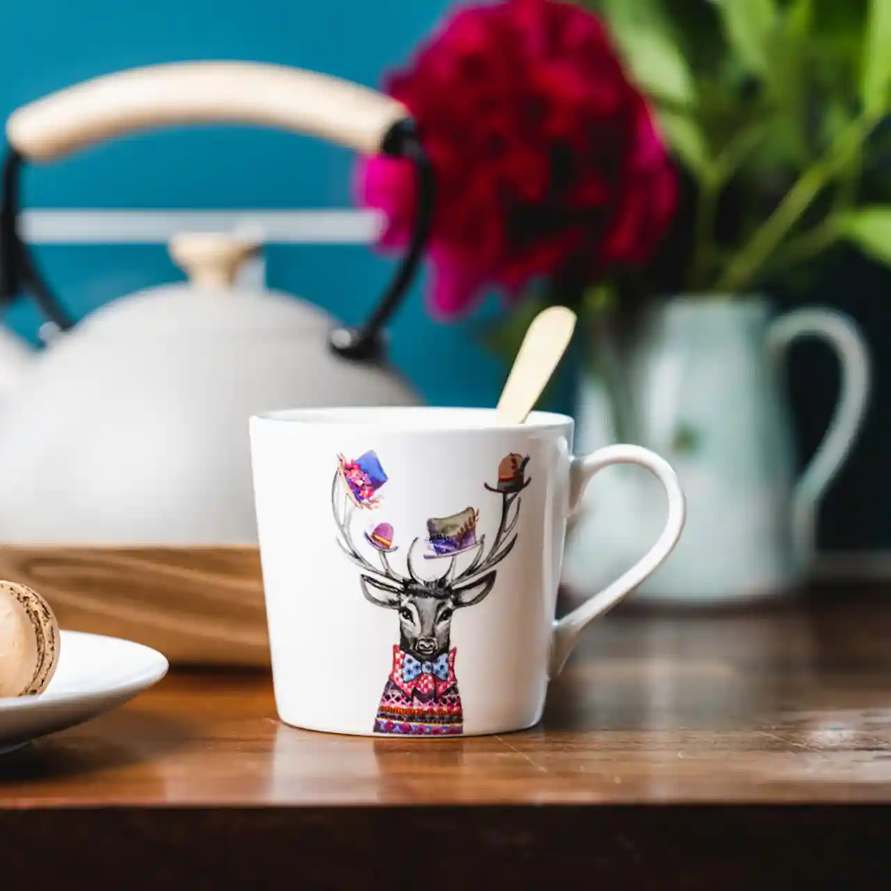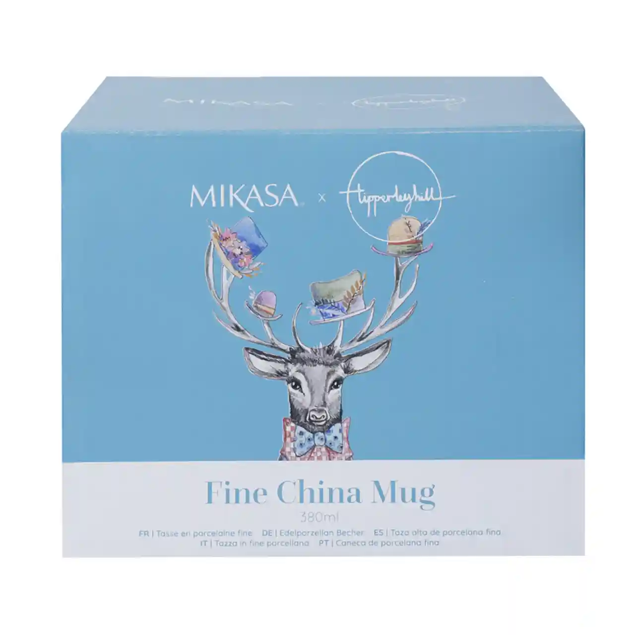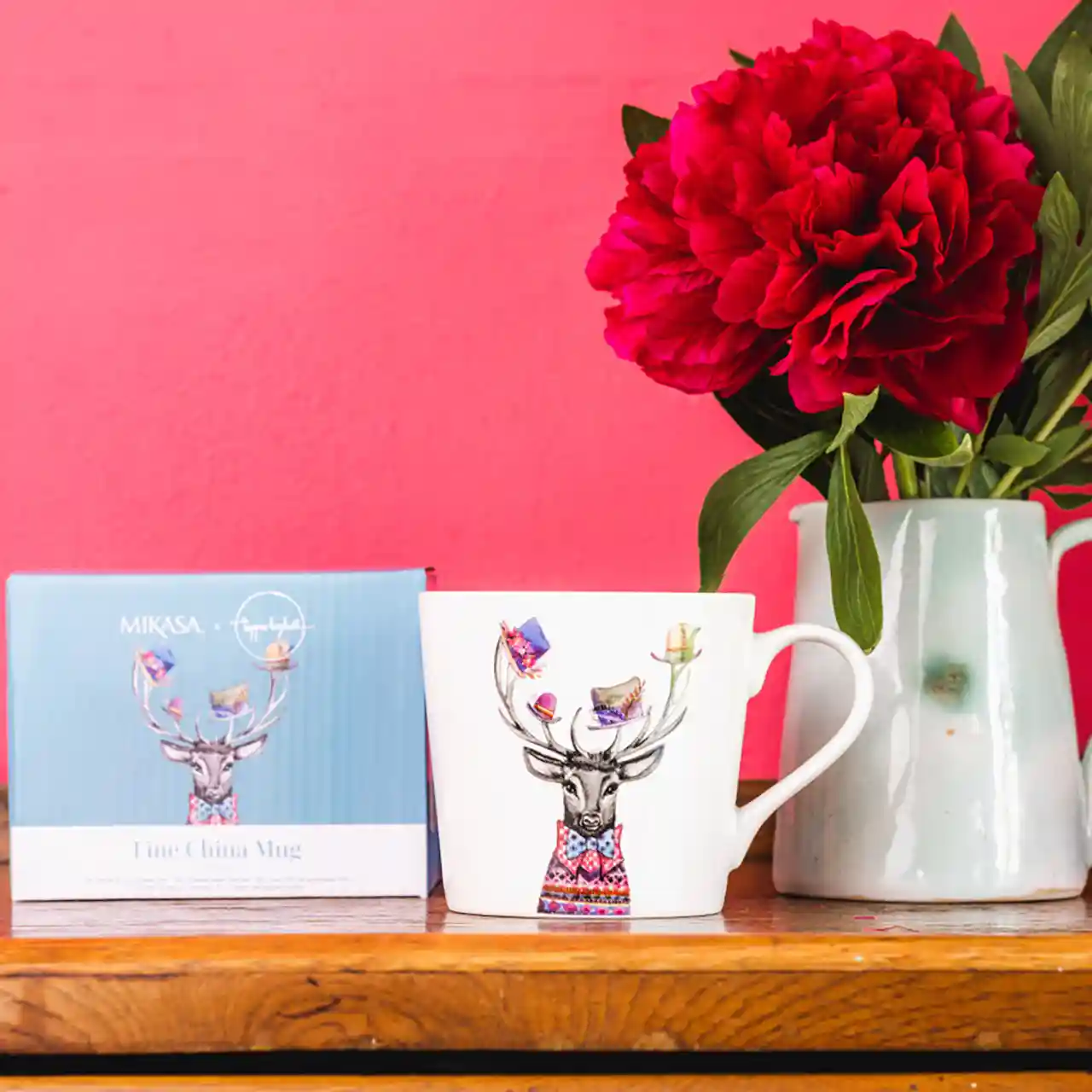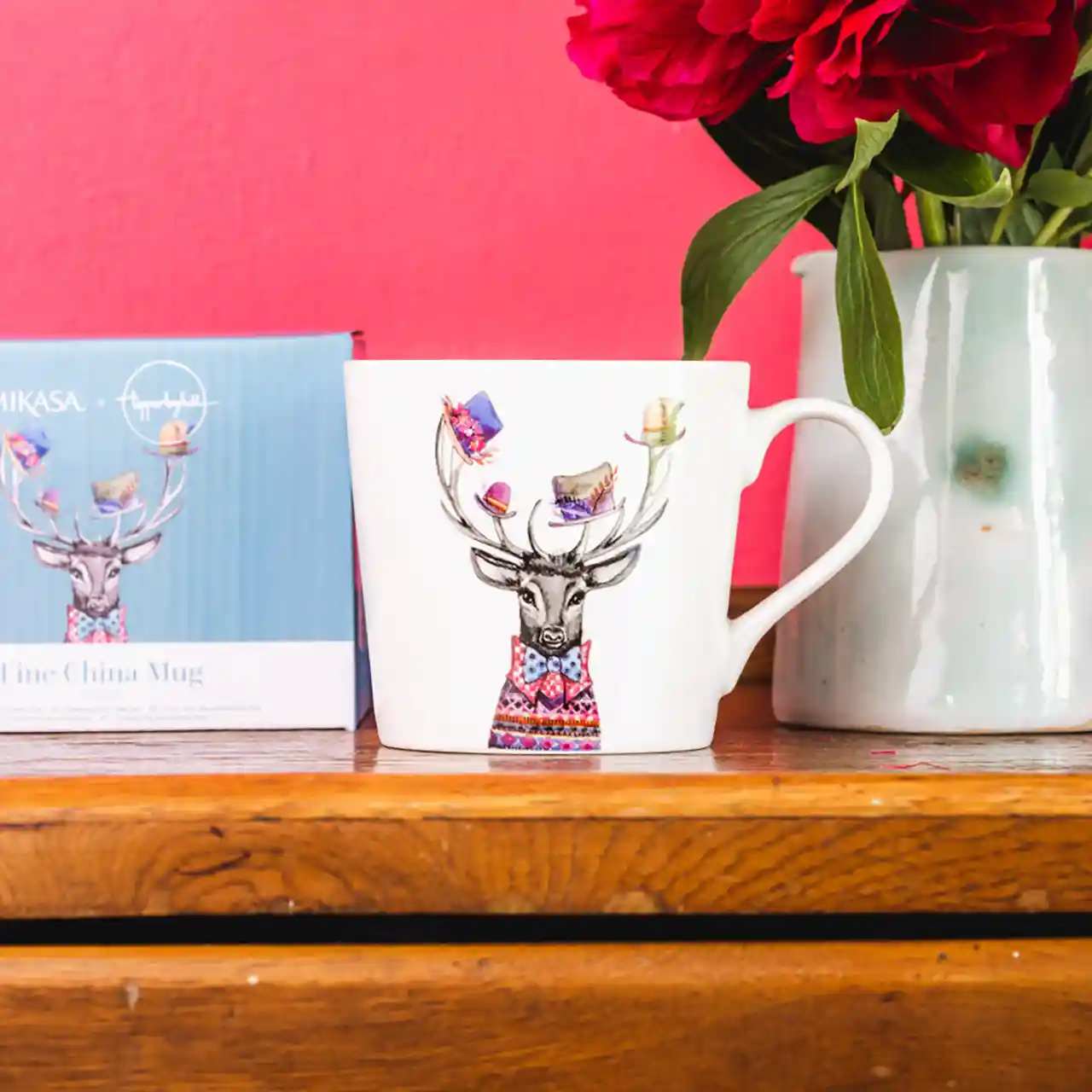 Porseleinen theemok van Mikasa x Tipperleyhill met een statige hert in bontgekleurde trui en strik, zijn gewei versierd met een vrolijke verzameling hoeden. Een mok met humor en klasse — ideaal voor wie zijn thee drinkt met een vleugje eigen stijl. Inhoud 380 ml, vaatwasser- en magnetronbestendig.