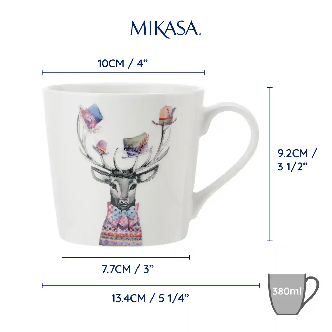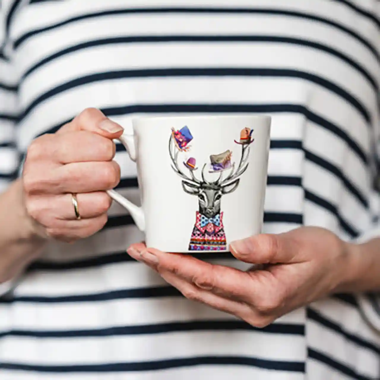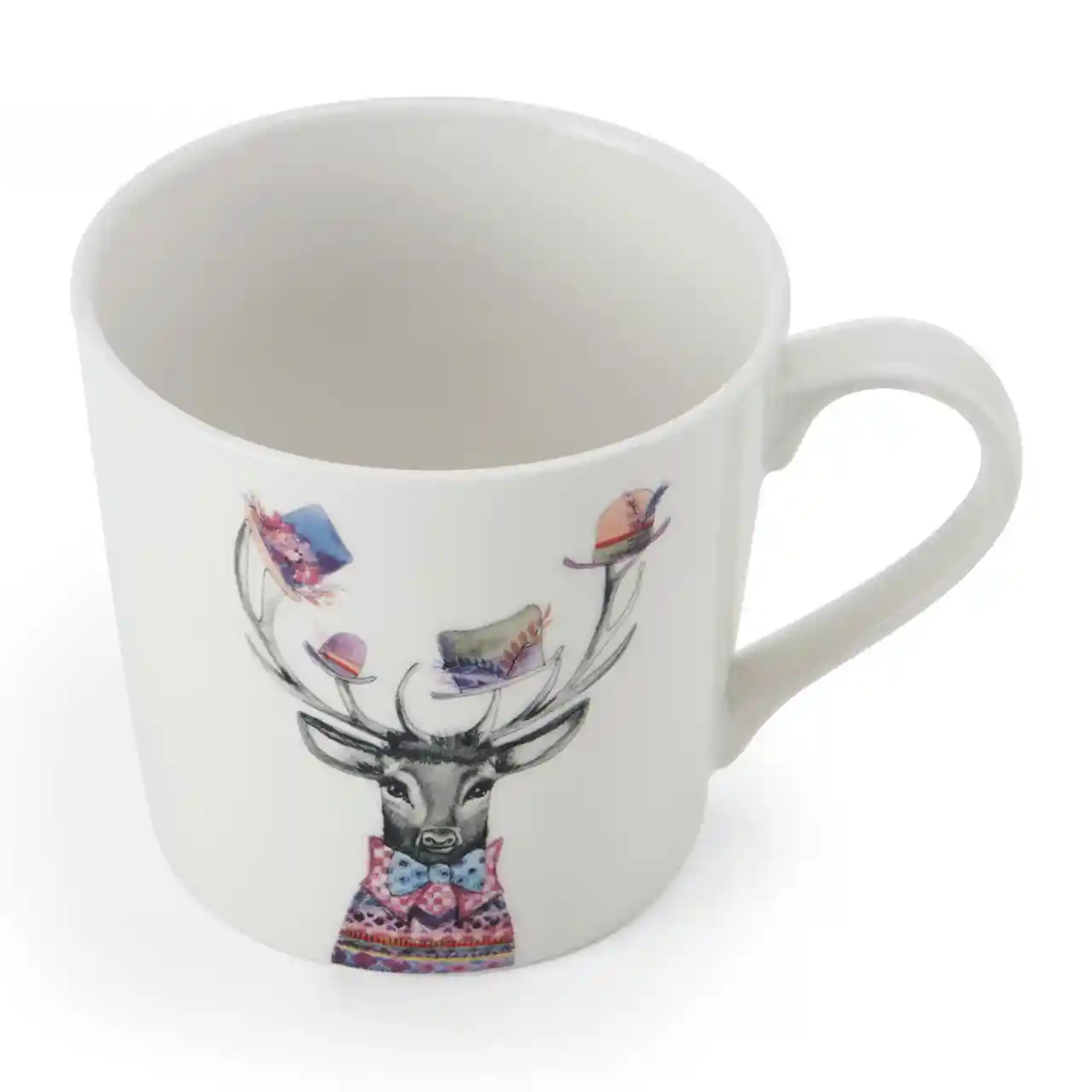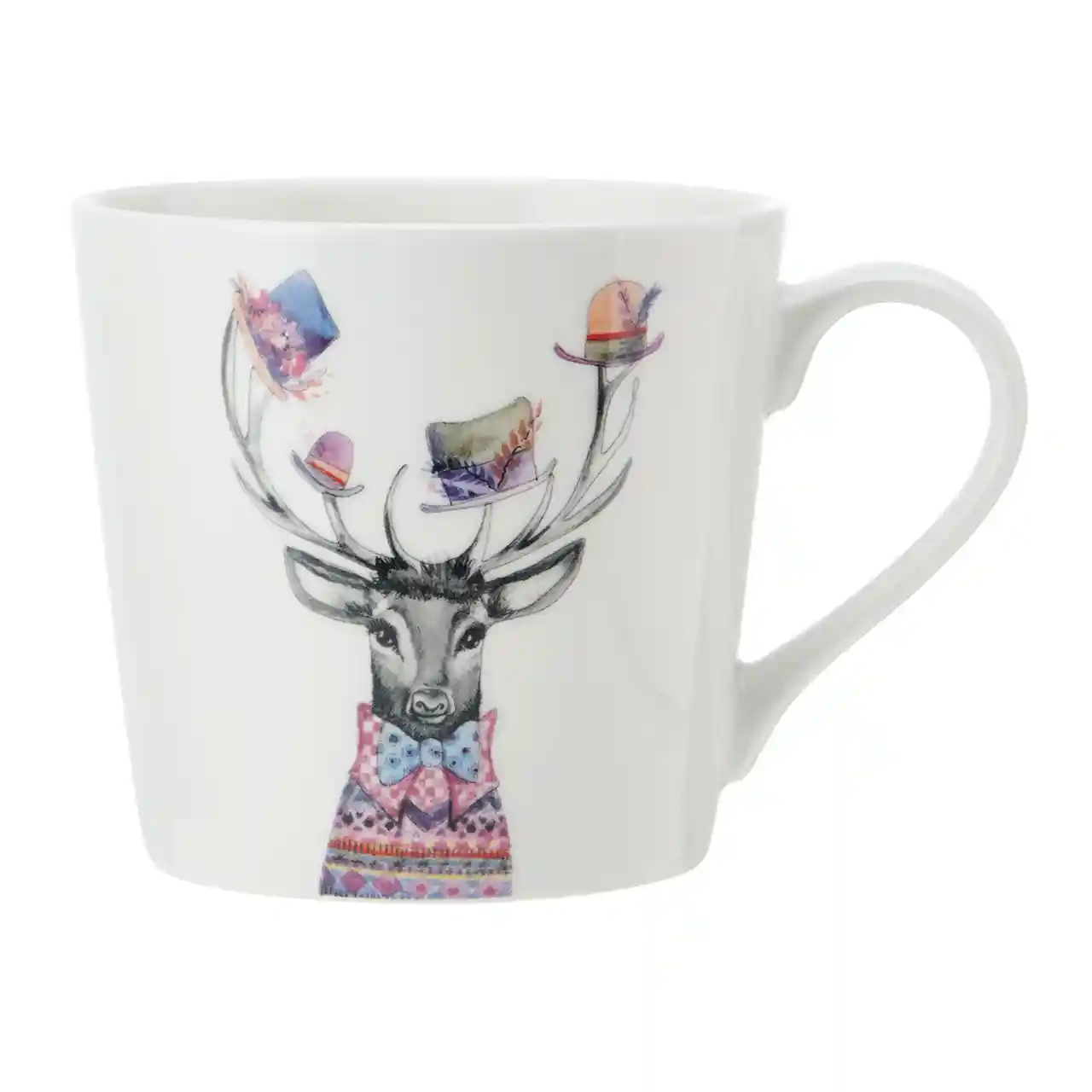 Porseleinen theemok van Mikasa x Tipperleyhill met een statige hert in bontgekleurde trui en strik, zijn gewei versierd met een vrolijke verzameling hoeden. Een mok met humor en klasse — ideaal voor wie zijn thee drinkt met een vleugje eigen stijl. Inhoud 380 ml, vaatwasser- en magnetronbestendig.