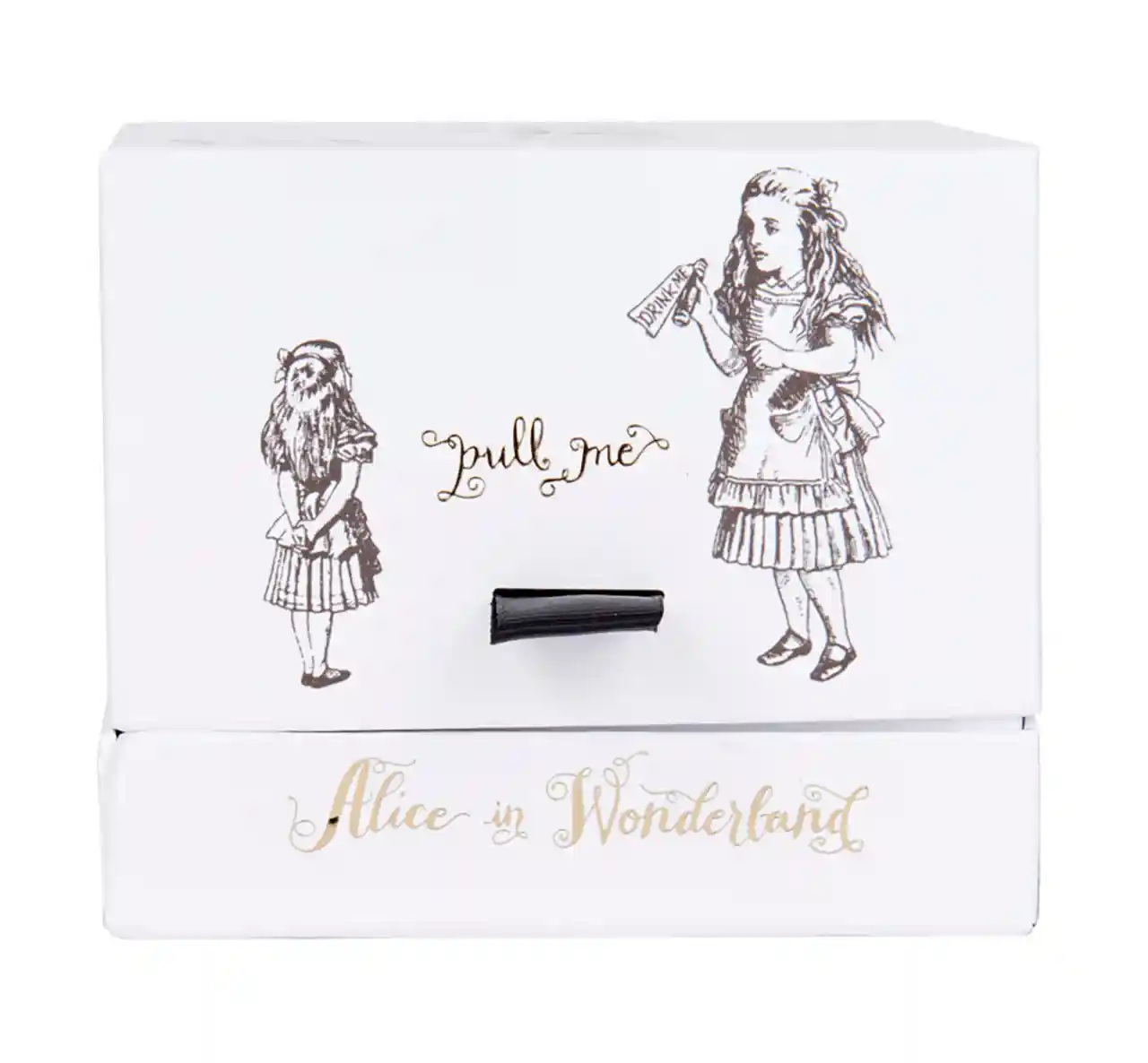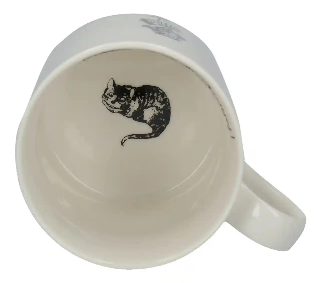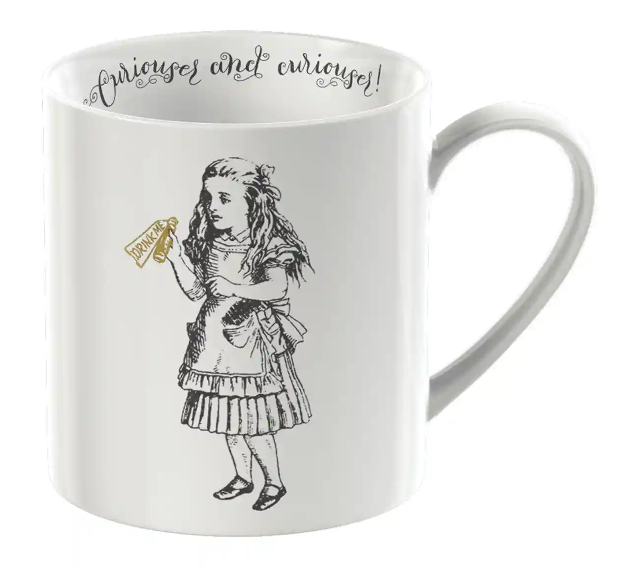Deze theemok van fijn porselein is versierd met een zwart-wit illustratie van Alice die beslist of ze wel of niet een slok neemt uit een fles met de tekst ‘Drink me’. De magische fles, afgewerkt in goud, glinstert tegen de zwart-witte schets en voegt een beetje extra verwondering toe aan het moment. De ontwerpen zijn geïnspireerd op een Alice in Wonderland kaartspel gebaseerd op illustraties van Sir John Tenniel (1820 – 1914). De overpeinzingen van Alice, ‘Curioser and curioser’, zijn afgedrukt op de binnenrand van de mok in een opvallend, wervelend lettertype. Draai de theemok om en je ontdekt wat er gebeurde toen ze besloot de instructies te volgen, met een miniatuurversie van Alice die verwonderd naar haar grotere, voormalige zelf staart. En dat is nog niet alles! Net als Wonderland zit deze mok boordevol nieuwe verrassingen. Drink je drankje op en je ziet de afbeelding van de Cheshire Cat in de bodem verschijnen. Vreemder en vreemder….
