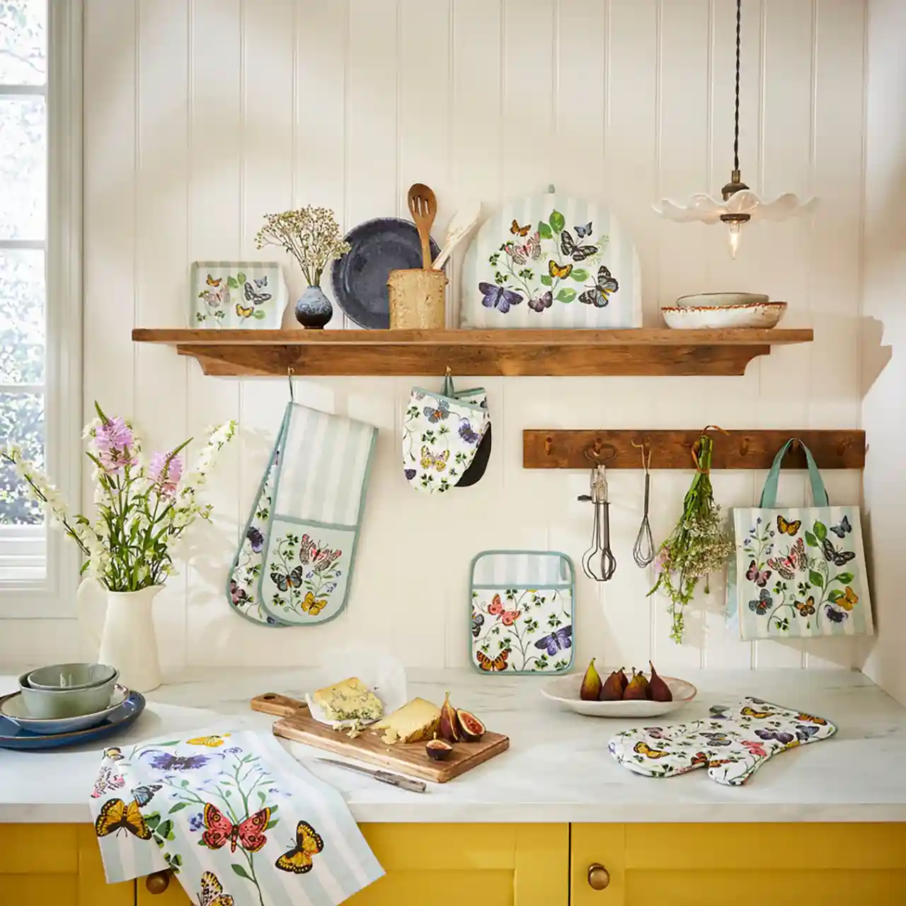 Butterfly Grove viert de natuur en het erfgoed met handgeschilderde vlinders en weidebloemen op een zacht crèmekleurige en gestreepte blauwe achtergrond. Weelderig gebladerte en levendige details creëren een romantische, schilderachtige collectie, die elke keuken een elegante en charmante uitstraling geeft.