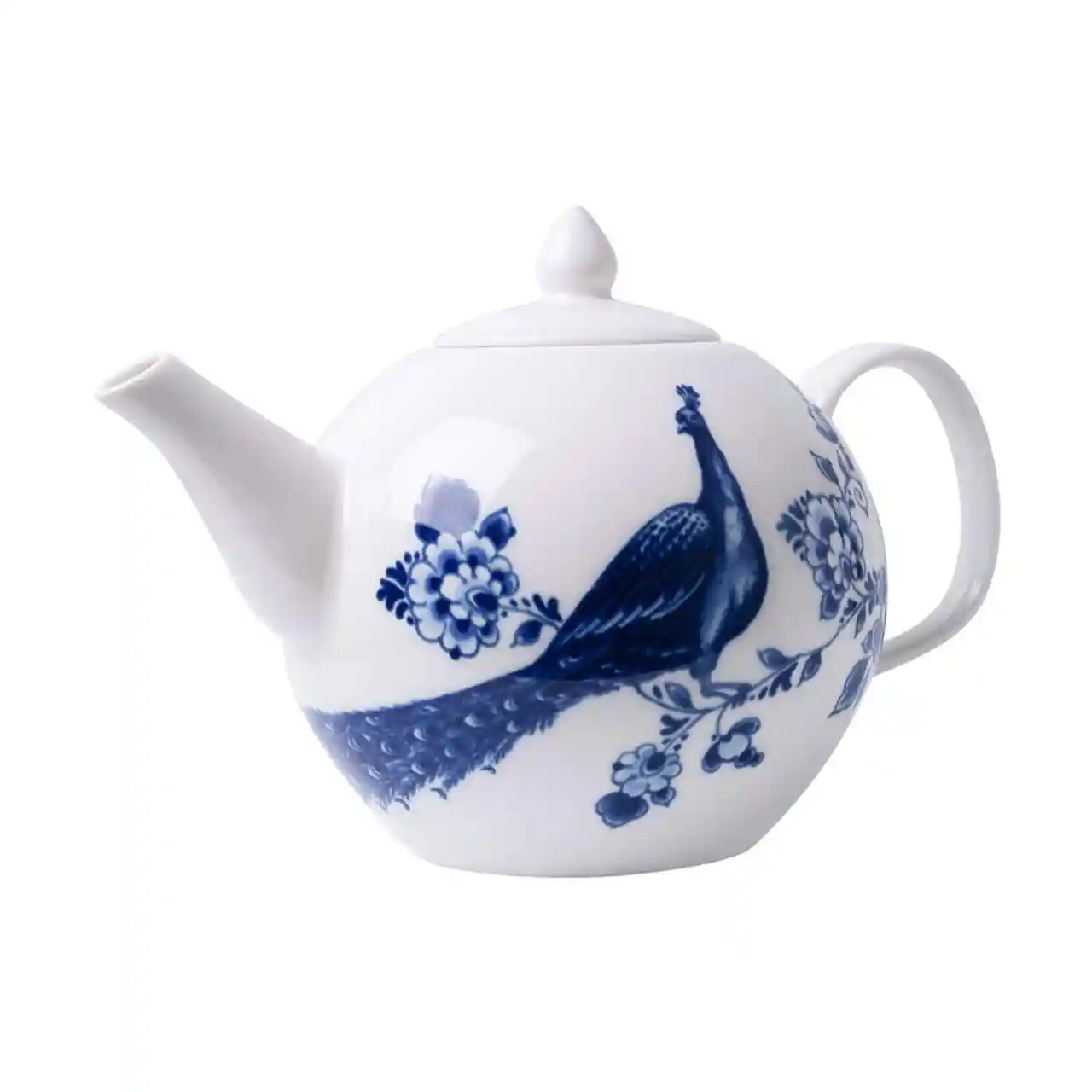 De theepot is gemaakt van porselein en is gedecoreerd met traditionele Delfts blauwe details en met een afbeeling van een paauw.