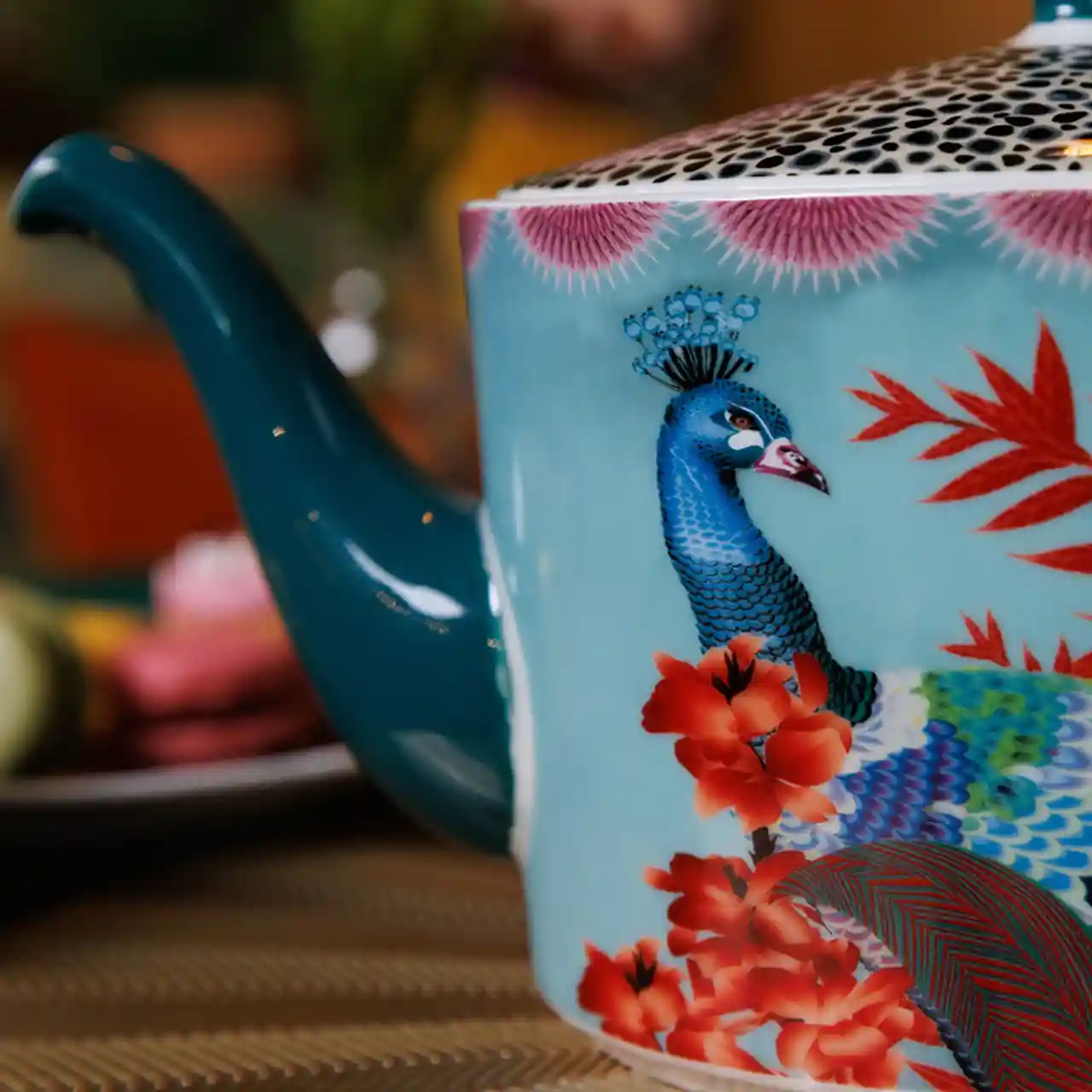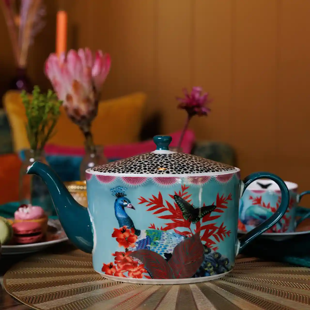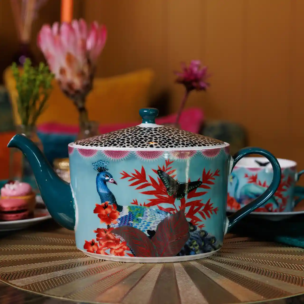 Een expressieve theepot die elke theetafel verandert in een tropisch kunstwerk.