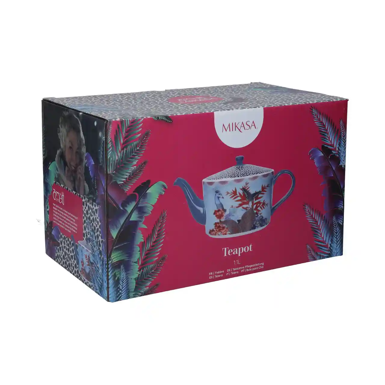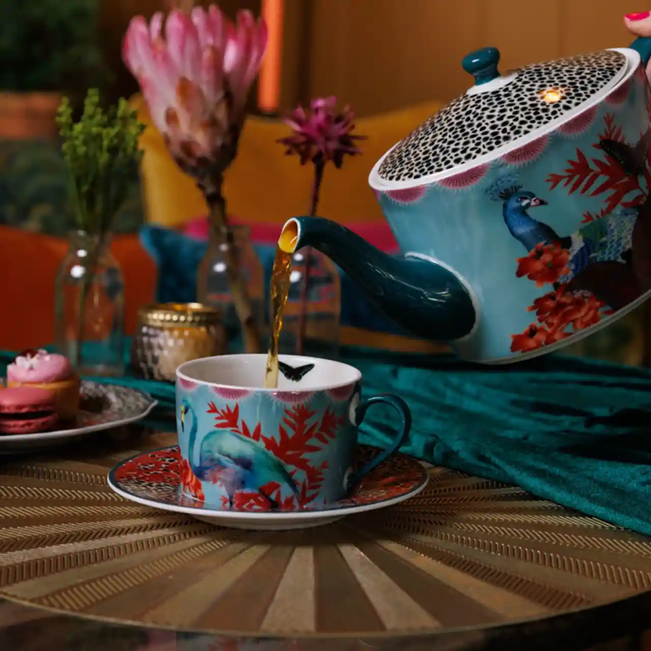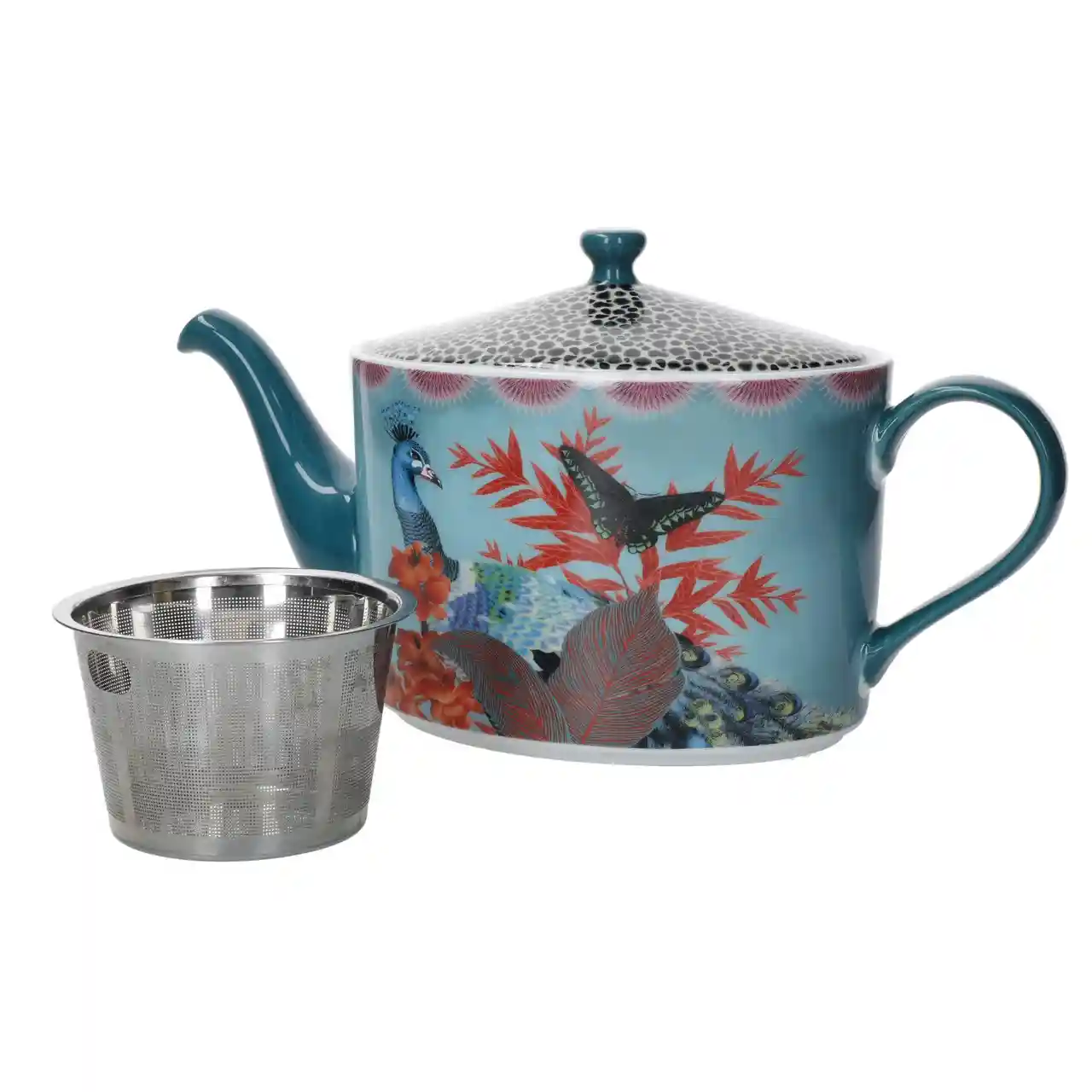 Een expressieve theepot die elke theetafel verandert in een tropisch kunstwerk.