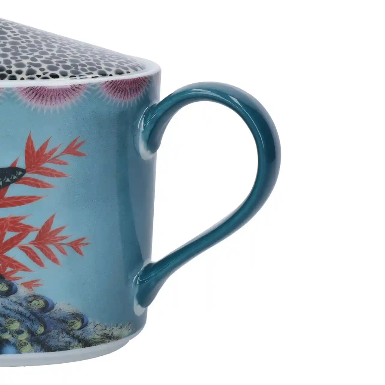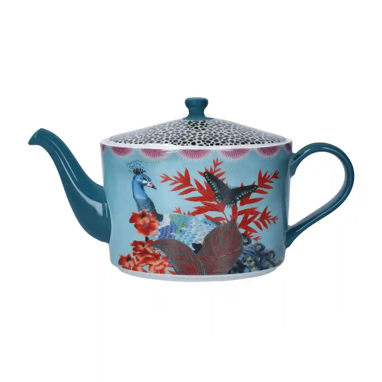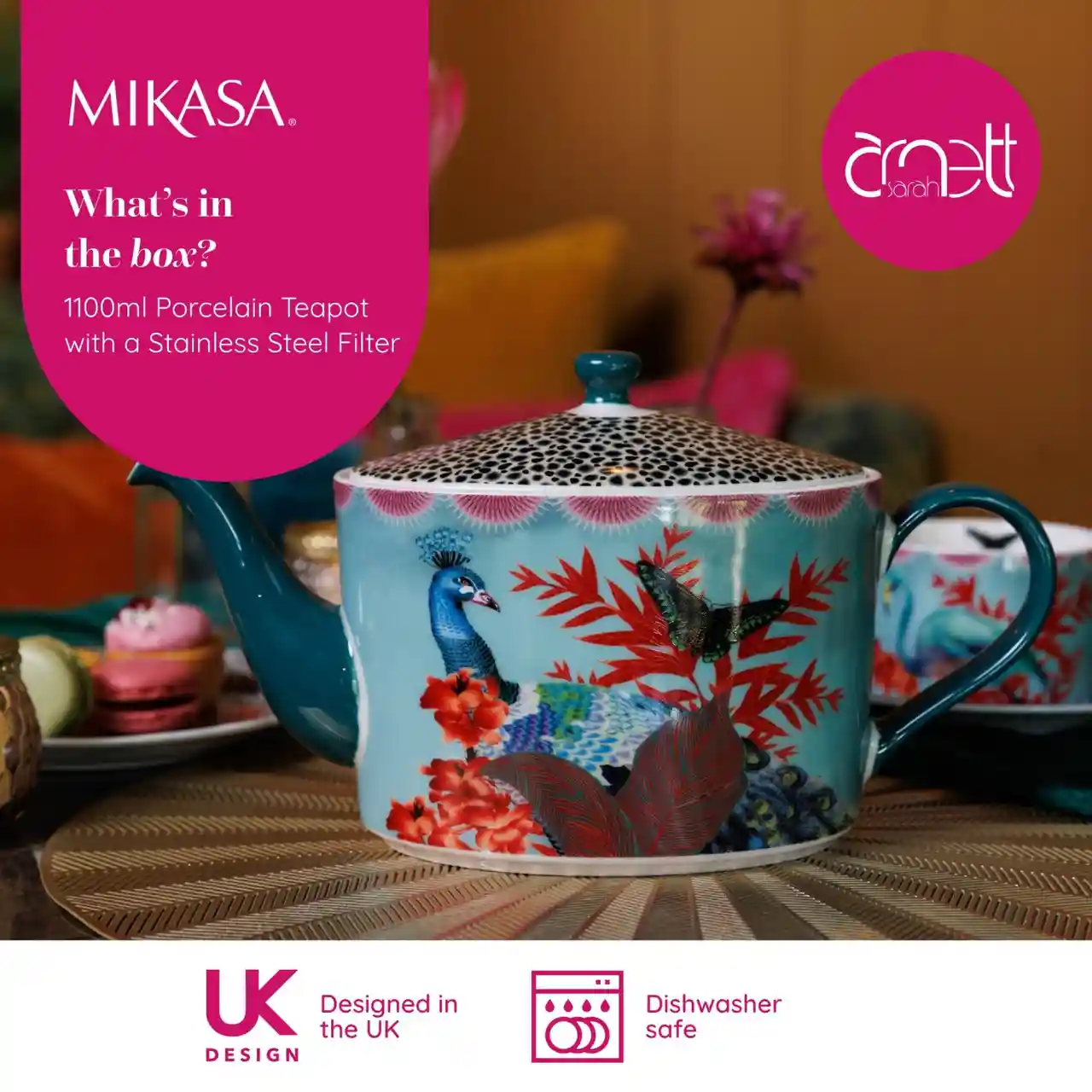 Het handgeschilderde ontwerp toont een trotse pauw te midden van koraalrode bladeren, exotische bloemen en een sierlijke vlinder. De levendige compositie weerspiegelt de unieke stijl van ontwerpster Sarah Arnett, waarin natuur, mode en fantasie naadloos samenkomen.