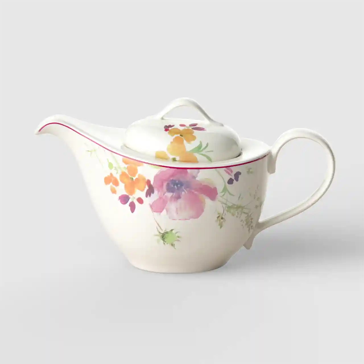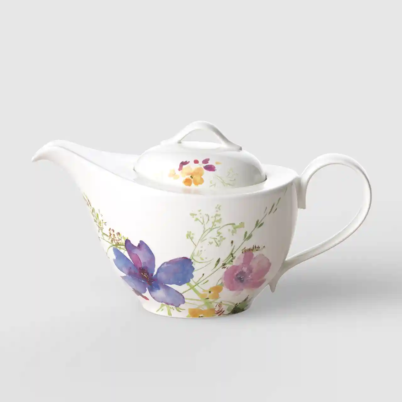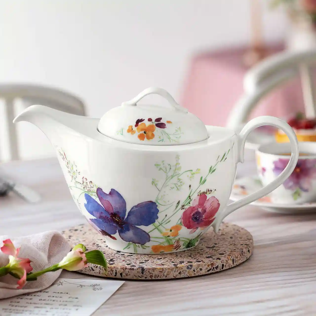 De Mariefleur serie is geïnspireerd door de tuinen waar Monet werkte in Giverny, Frankrijk. Een samenspel tussen groene tinten van uitgestrekte grasvelden en bloemen in aquarel in heldere paars- en geeltonen. Een vleugje zomer aan tafel bij elke maaltijd. De motieven op ieder deel van het servies zijn net even anders en zo lijken de afbeeldingen te groeien en te bewegen, uw tafel zal er steeds net even anders uit zien.